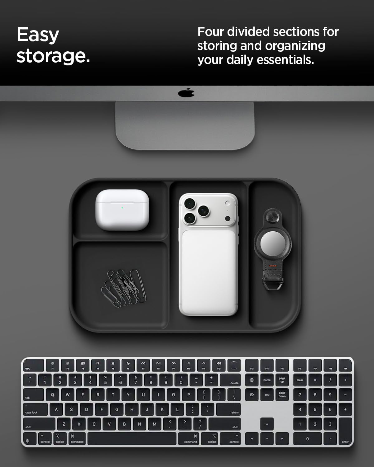 Smart Sectional Design: Features 4 compartments of varying sizes to neatly organize essentials like keys, wallet, phone, watch, and jewelry.