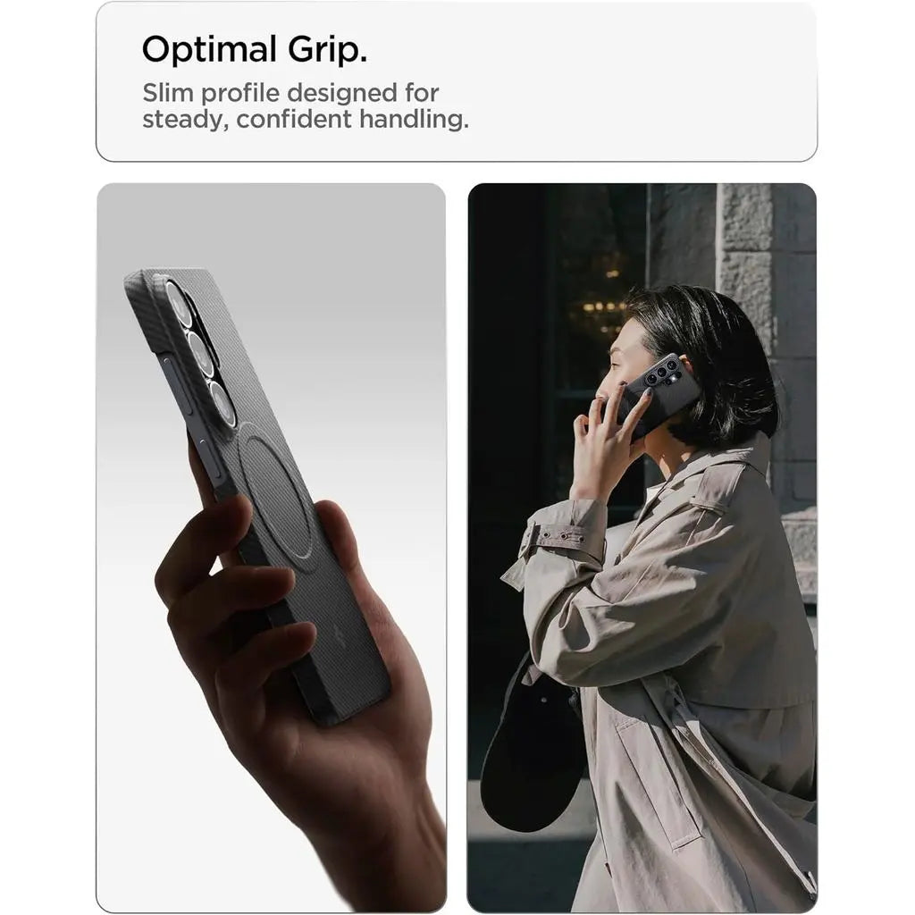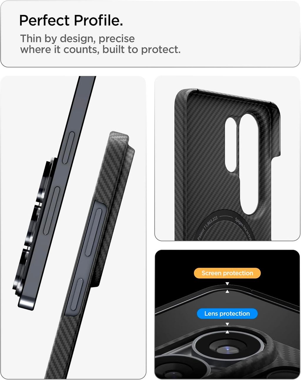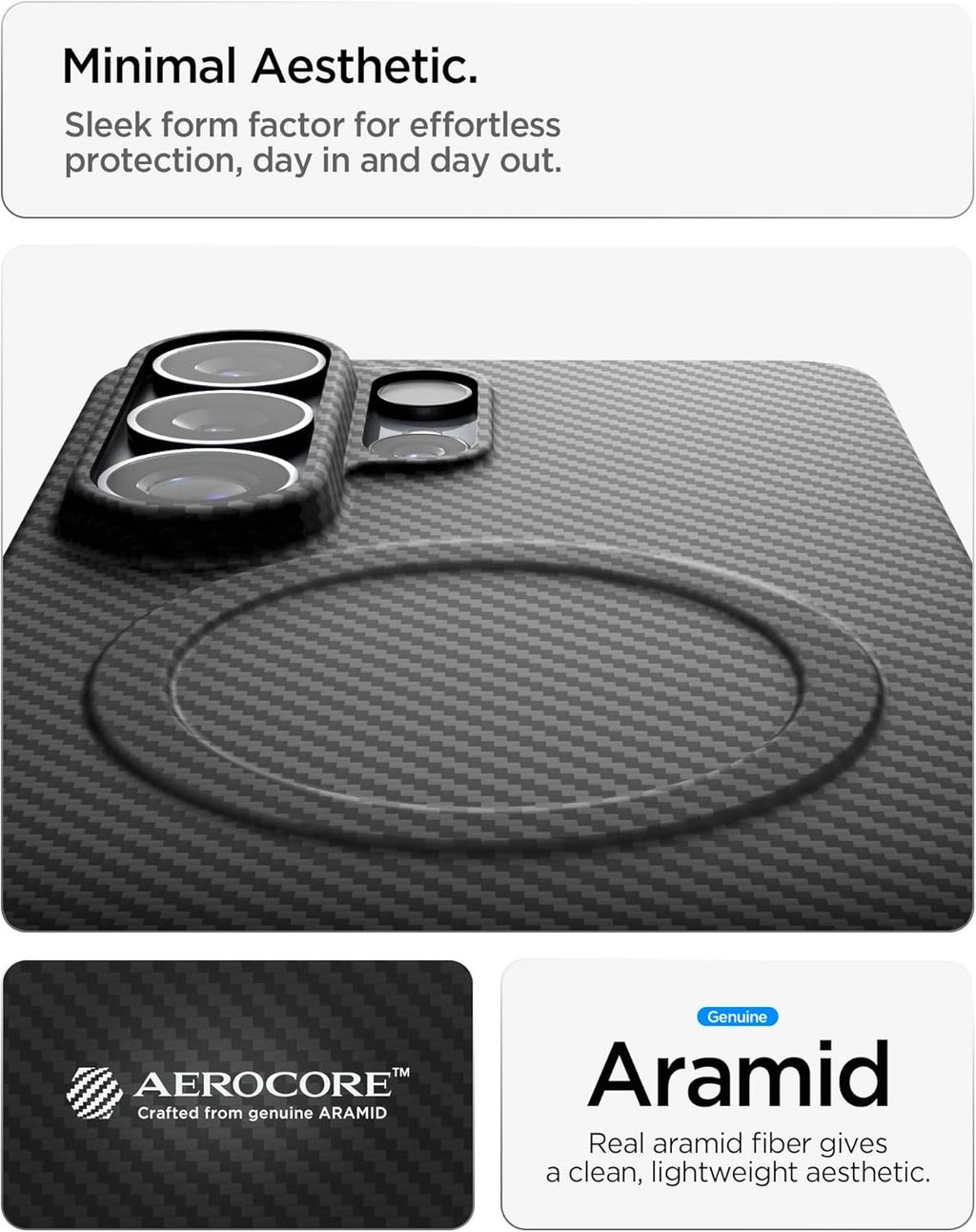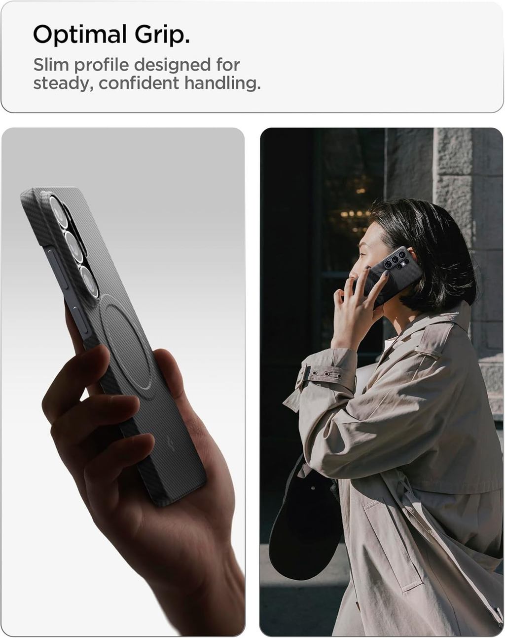 MagSafe-compatible aramid case with precise alignment and faster charging. Slim 600D aramid build offers durable protection, full camera coverage, enhanced grip, and easy on-off design for everyday Galaxy use.