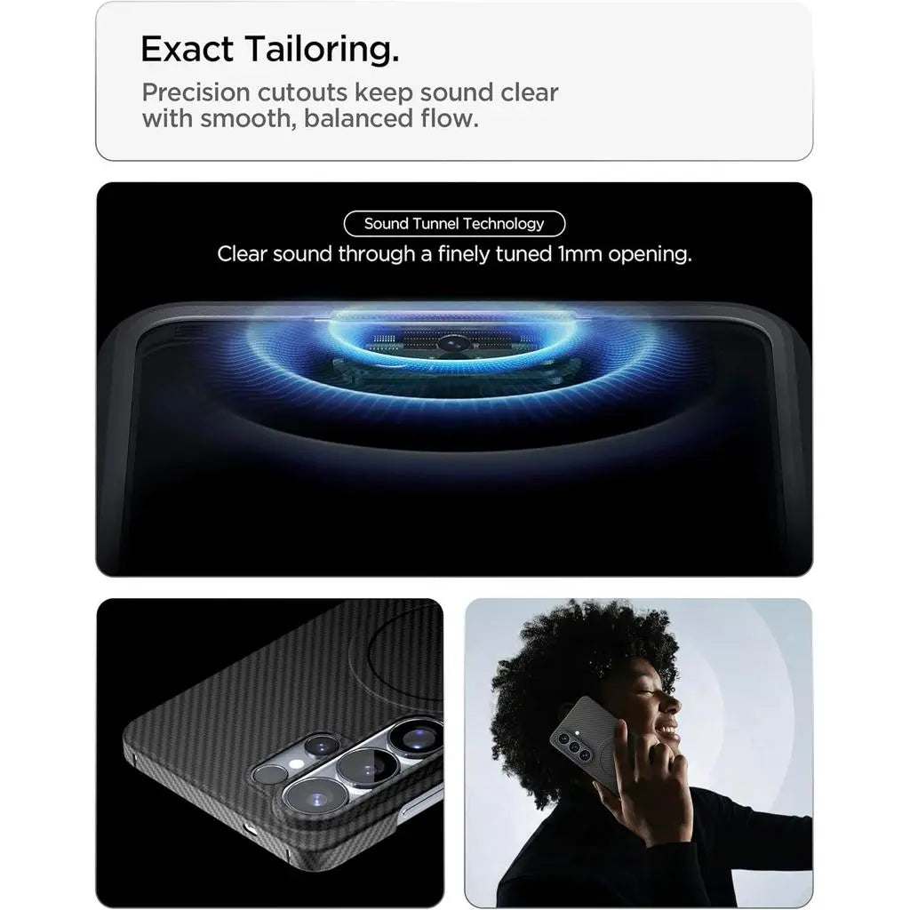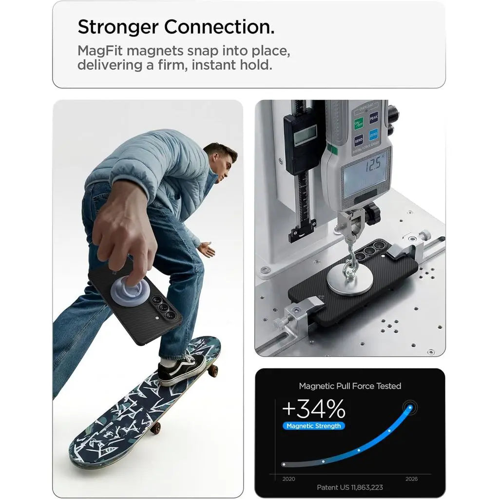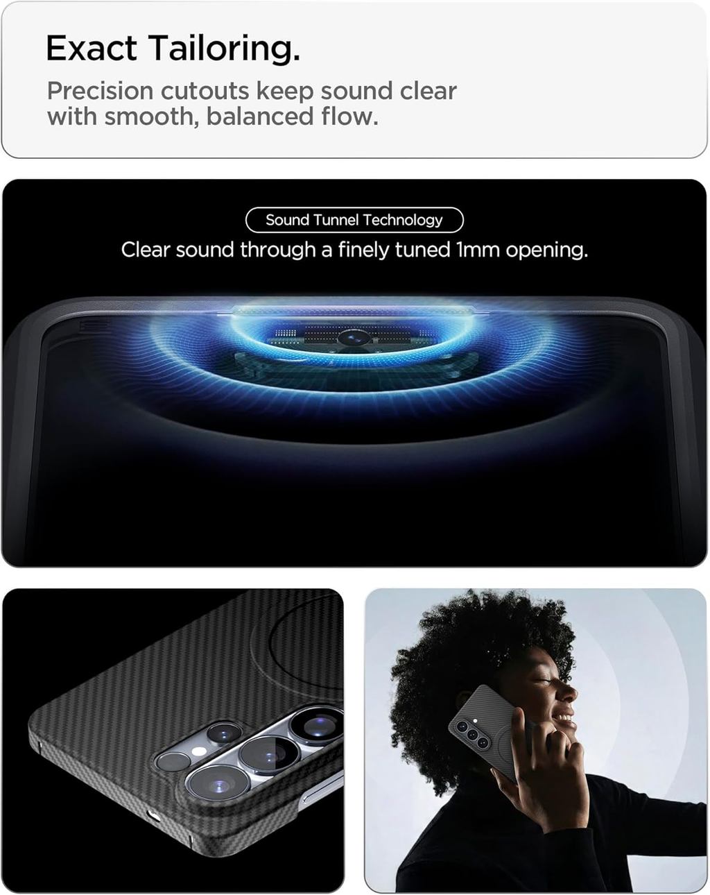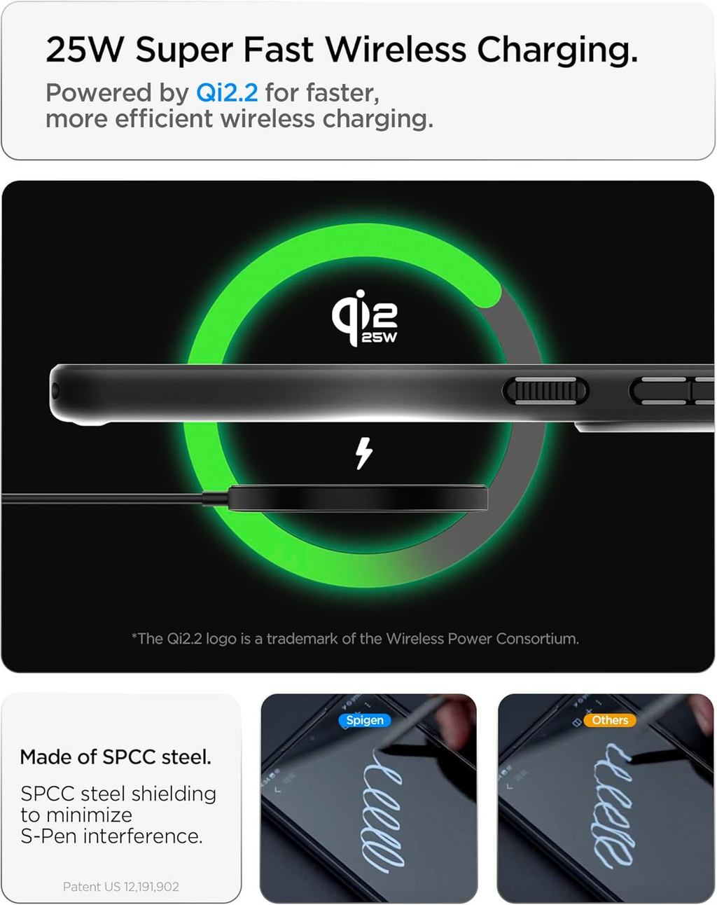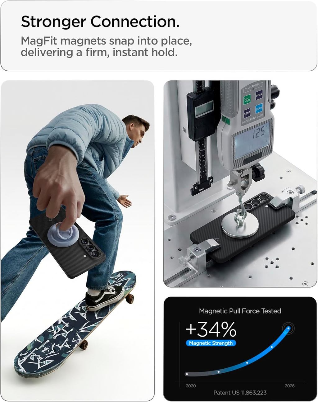 MagSafe-compatible aramid case with precise alignment and faster charging. Slim 600D aramid build offers durable protection, full camera coverage, enhanced grip, and easy on-off design for everyday Galaxy use.