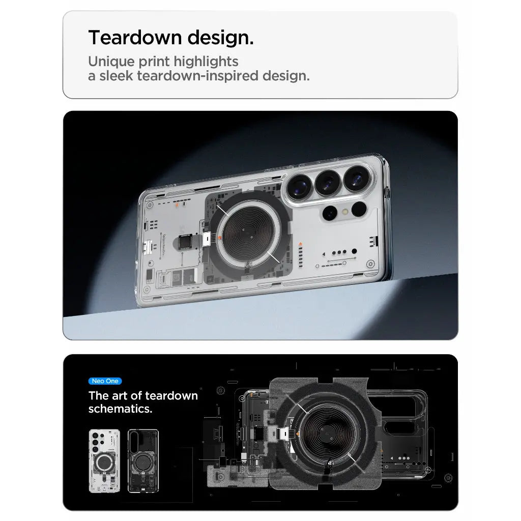 Tear it down. The Neo:One deconstructs your Galaxy S26 with all-new teardown schematics. Satisfy your craving for transparent tech without losing your palate for protection. Experience the art of deconstruction day after day. Now with Mag Fit to unlock new magnetic accessories for your Galaxy. We got you
