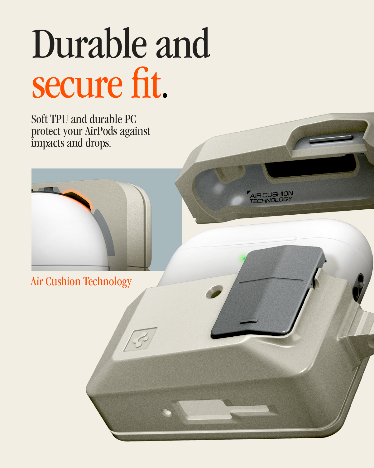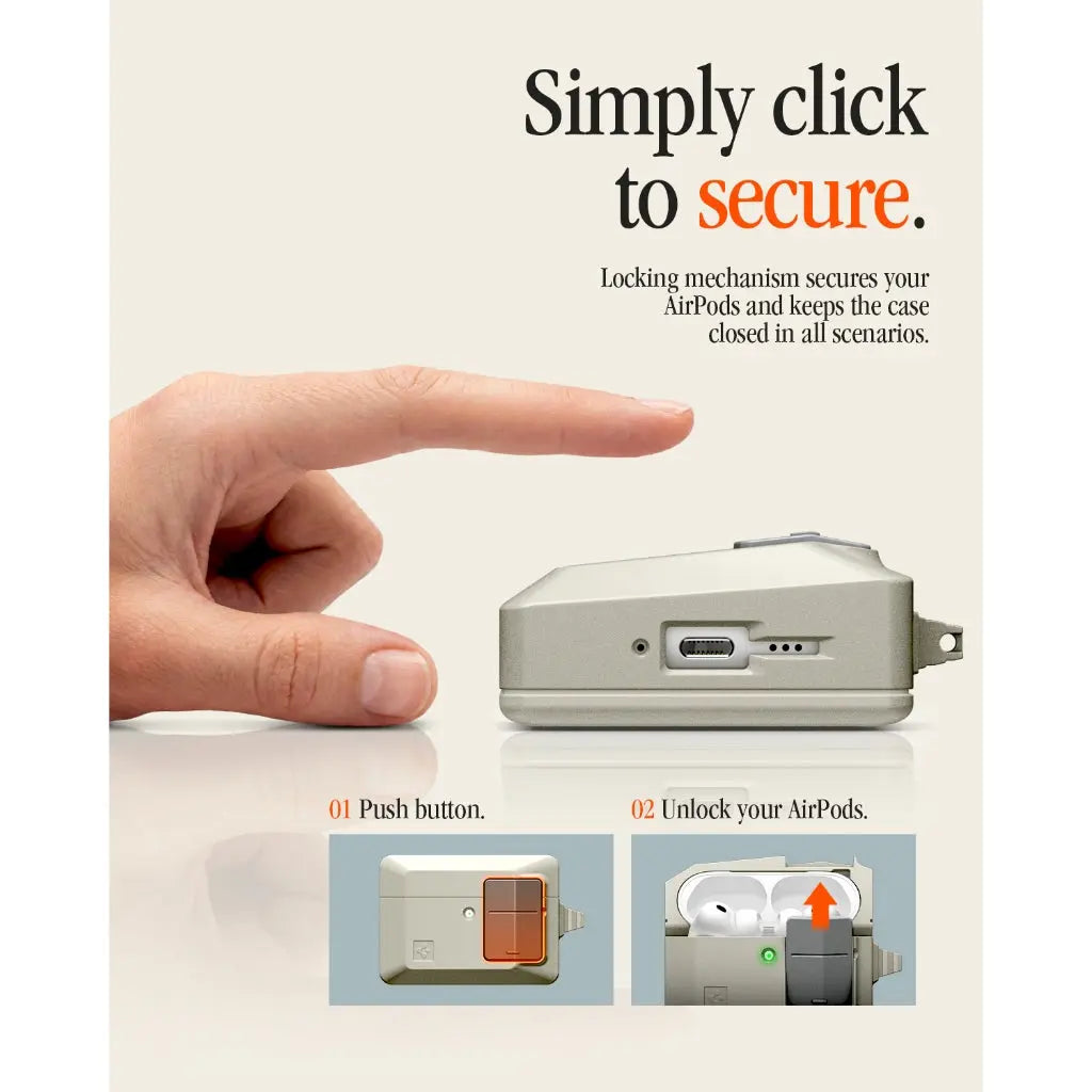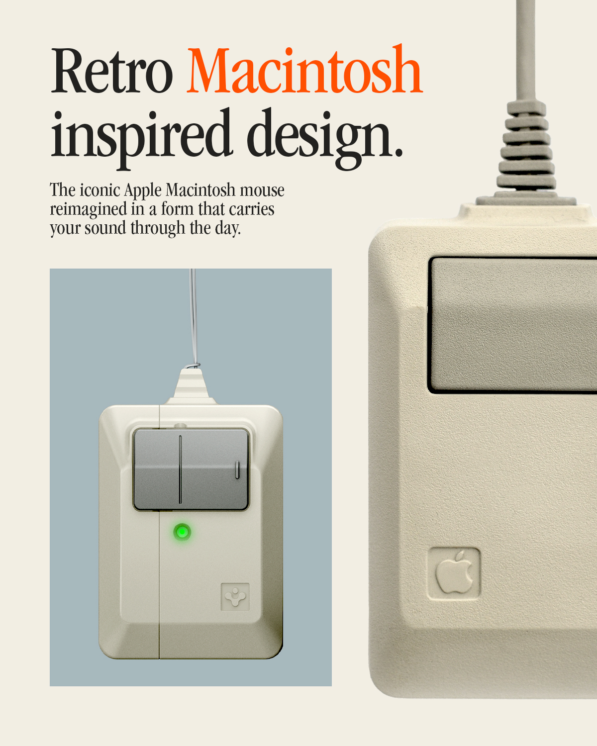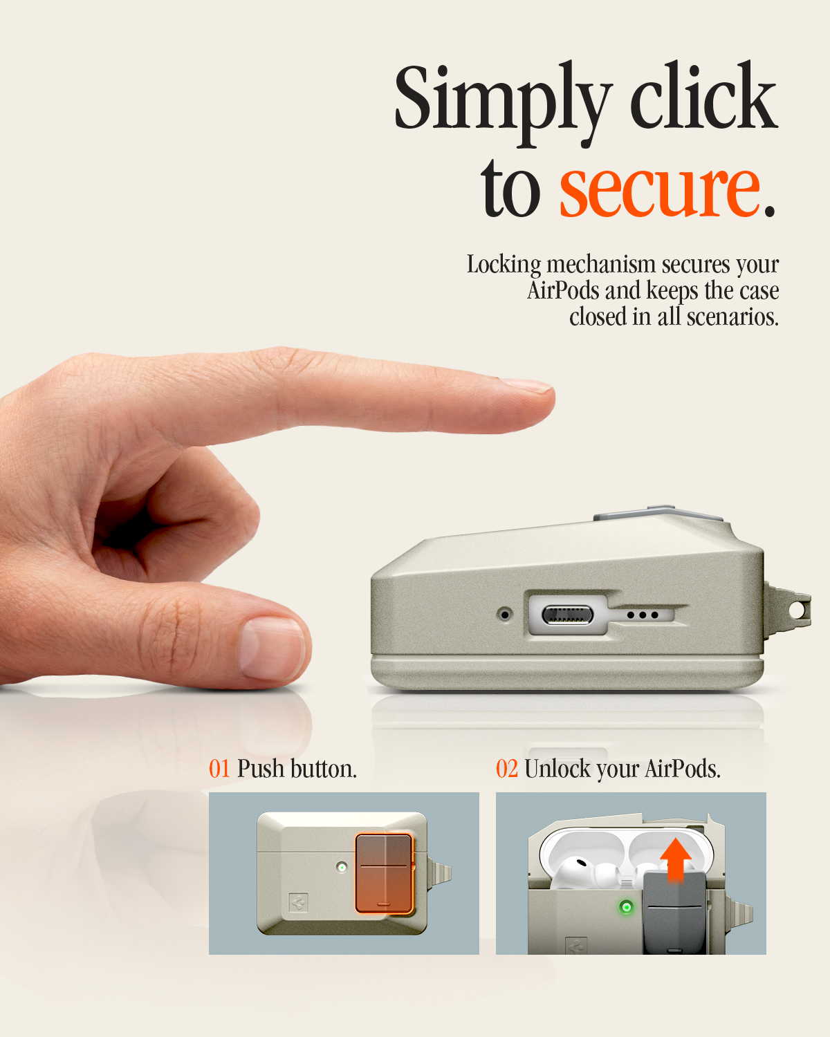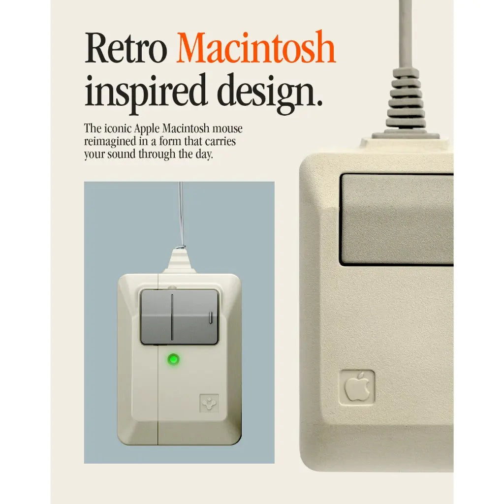 Mouse-Click Secure Lock – The innovative lock clip prevents AirPods from falling out at all times—designed to mirror the tactile feel and iconic look of the classic Macintosh mouse.