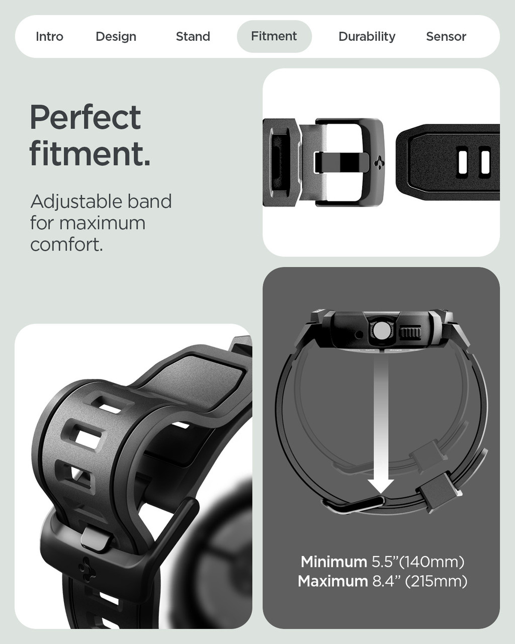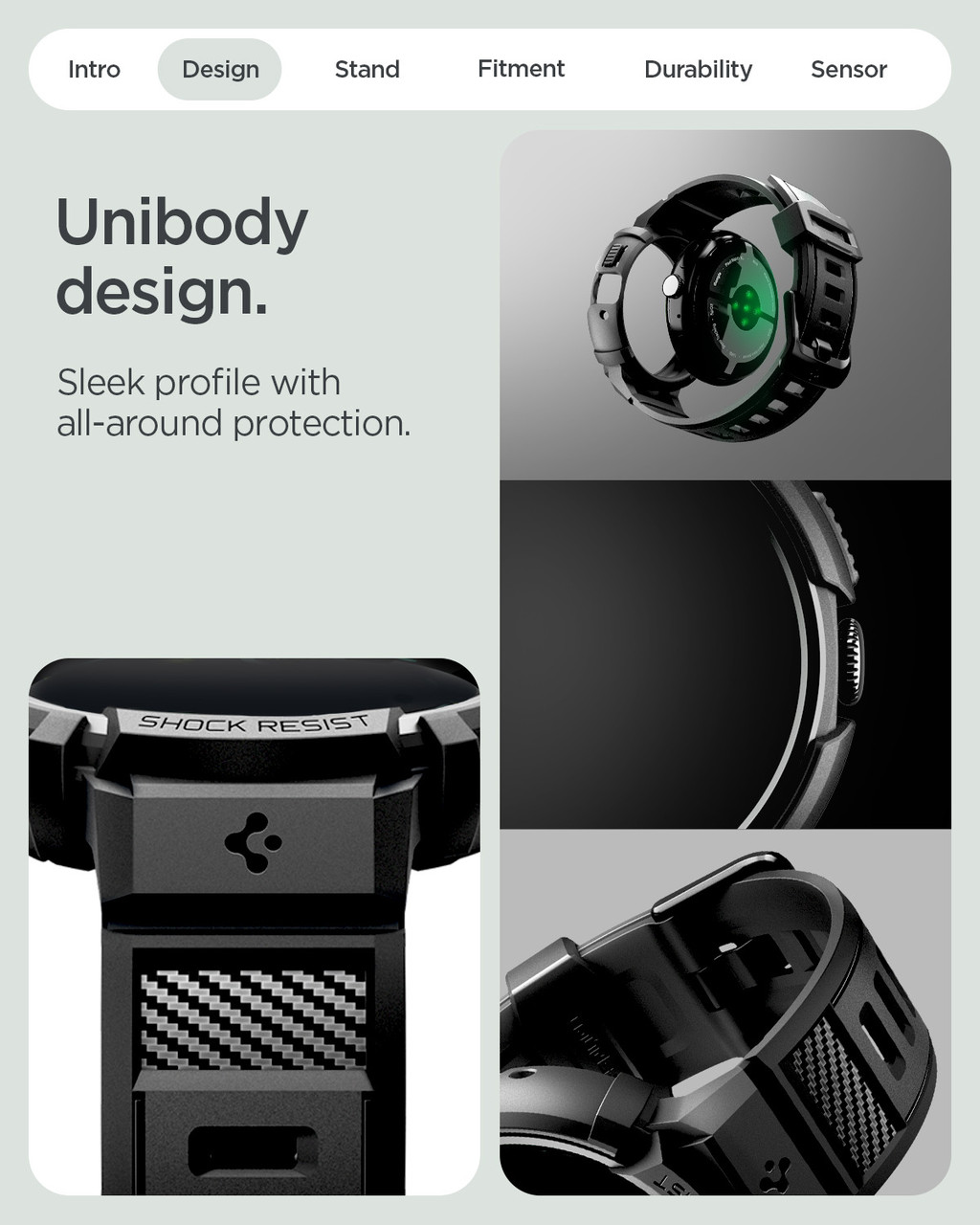 Rugged design: Unibody case with unique carbon fiber accents absorbs shock, keeping your watch safe from bumps and scratches