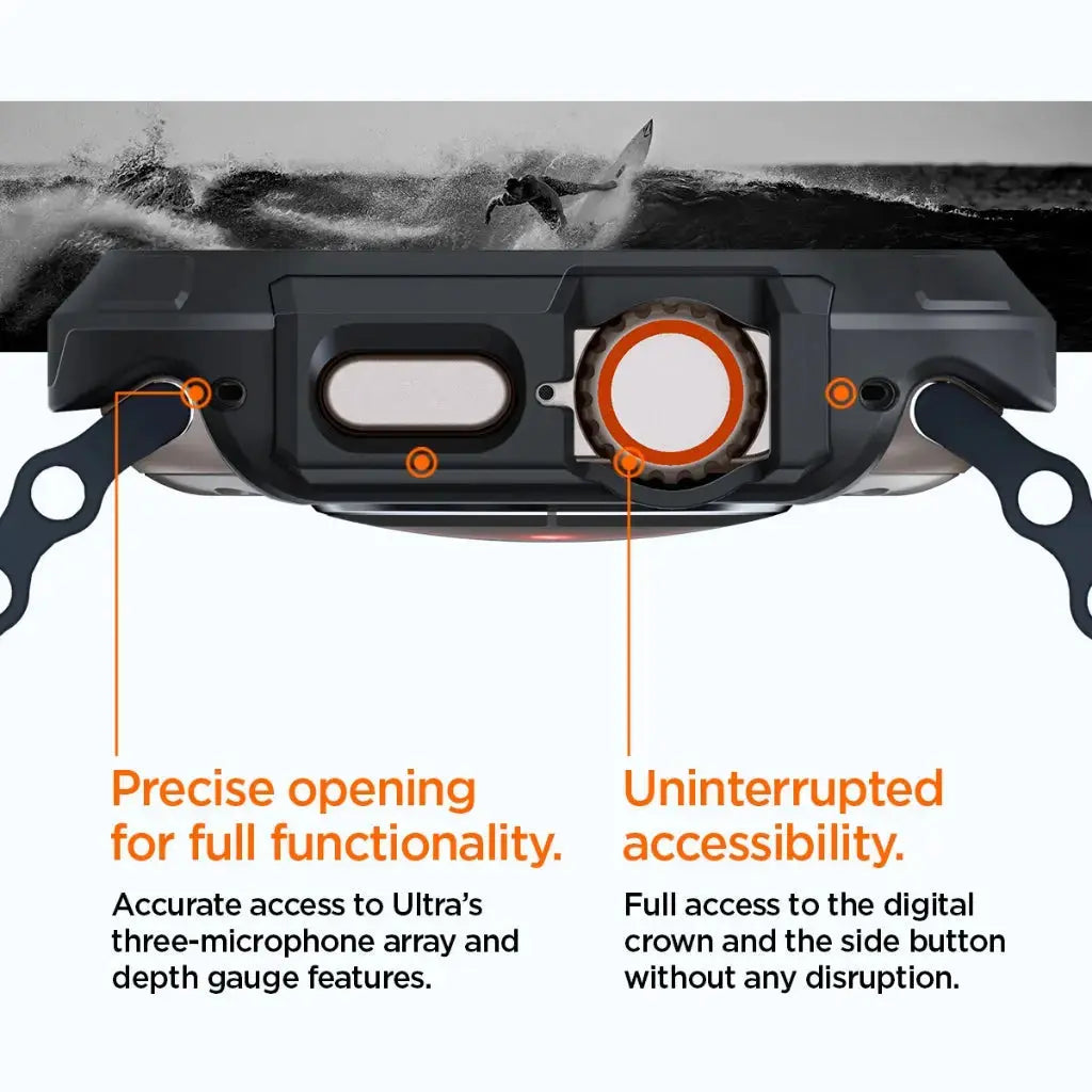 Rugged aesthetics and functionality: Sleek and rugged Apple Watch Ultra case with an orange accent on the Action Button